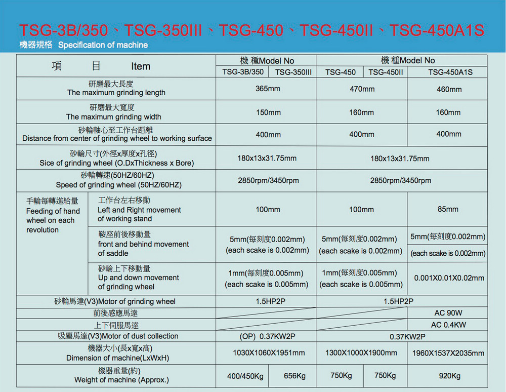 Slide rail of saddle is V and flat type desige, TSG-450 is V type with double track,and with(TEFLON)flap,those makes movement ofworking stand light and fast to assure accuracy.